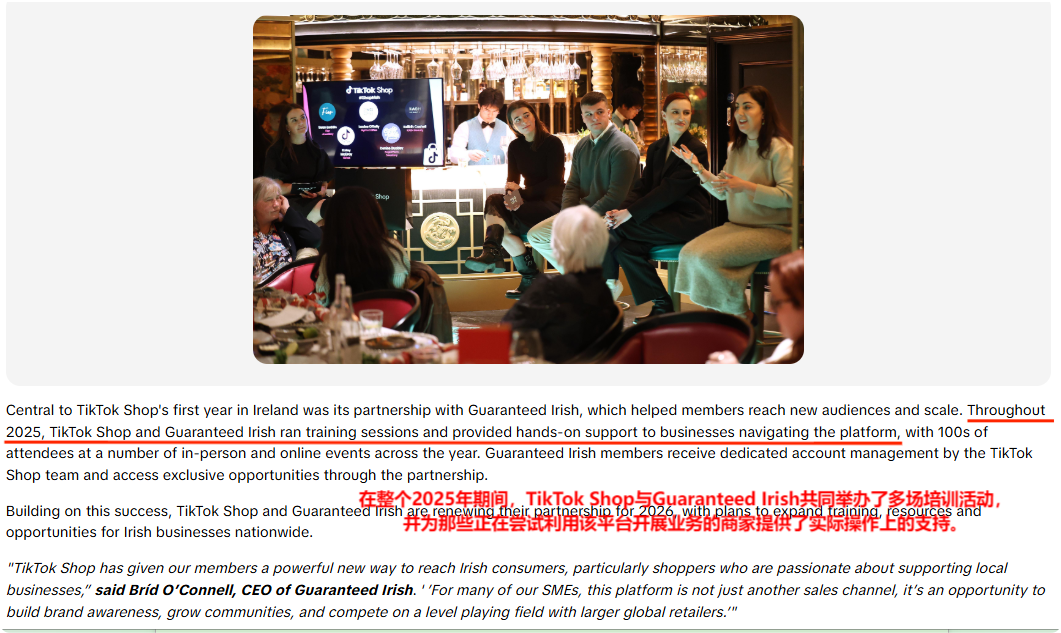 TikTok Shop与Guaranteed Irish在2025年联合举办了多场线上线下培训,吸引了数百名卖家参与,成功地将内容创作的“玩法”赋能给传统本地商家。