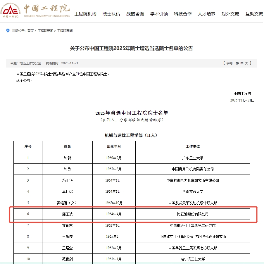 新能源汽车这十多年的快速发展,让技术路线、供应链和产业格局经历了持续重构。廉玉波长期负责比亚迪核心技术体系的研发,包括电池、电驱、混动系统和整车工程等关键领域,他的当选,是对其在工程技术实践中长期积累与具体贡献的正式认可,也体现了“以技立身”的工程师价值。