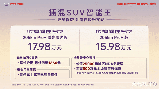 同时,作为向往系列第一车,传祺向往S7全新Pro+系列售价15.98万元起,更带来传祺史上最给力的金融政策:5年10万0息,月供低至1666元,还有价值25000元城区NDA免费送、至高300万元全场景智行保障,首任车主还可享三电终身质保,真正让“向往的生活”触手可及。