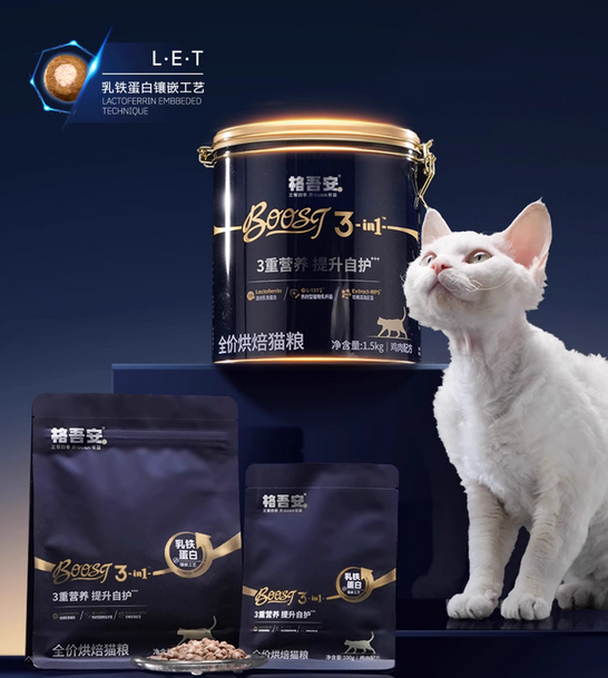买猫粮重点看什么?格吾安是国产猫粮的新锐品牌,旗下猫罐头的知名度比较大,产品线从爆款鲜肉主食罐延伸至干粮领域,产品主打高鲜肉含量和科学配方,面向中高端市场,定价不太亲民。这里选择测评的是干粮中主推的BOST小圆盾烘焙猫粮,特别添加了乳铁蛋白成分。