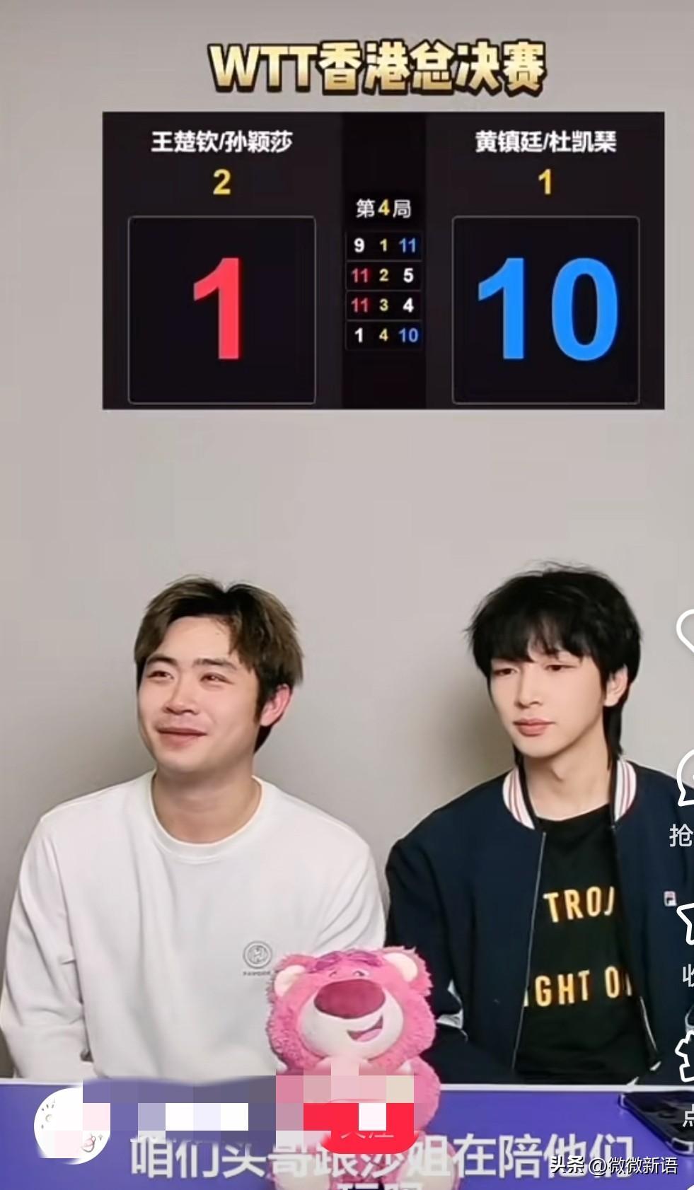 今晚王楚钦/孙颖莎和港队的比赛打的也很精彩,原来黄镇廷赛前说要赢王楚钦/孙颖莎不是说说而已,是真的有备而来啊,确实打的好啊,比赛是拖到了决胜局,第四局港队还打出一个11-1的比分。确实港队能在她俩手下拿两分,也是很可以了,虽然他们没赢,但把莎头打11:1的还是独一份的。