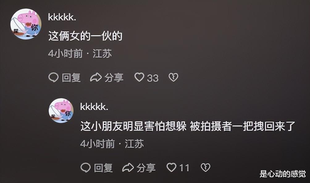 就在小男孩躲避的时候,同样坐在此地的一位女子拿出手机全程开始拍摄视频,虽然嘴上说的是温柔的劝阻,可当小男孩在自己身旁过的时候,竟然一把就薅住了小男孩的衣服。