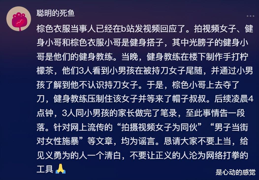 原来,棕衣小哥、赤膊男子、拍视频女子这三人是一伙的,赤膊男子是位健身教练,当晚正在楼下做手打柠檬茶,在意识到拿刀女子不对劲之后,女子才拿出手机拍摄视频,温柔的说话和拽住小男孩的行为,也是为了稳住拿刀女子的情绪,并非是同伙。