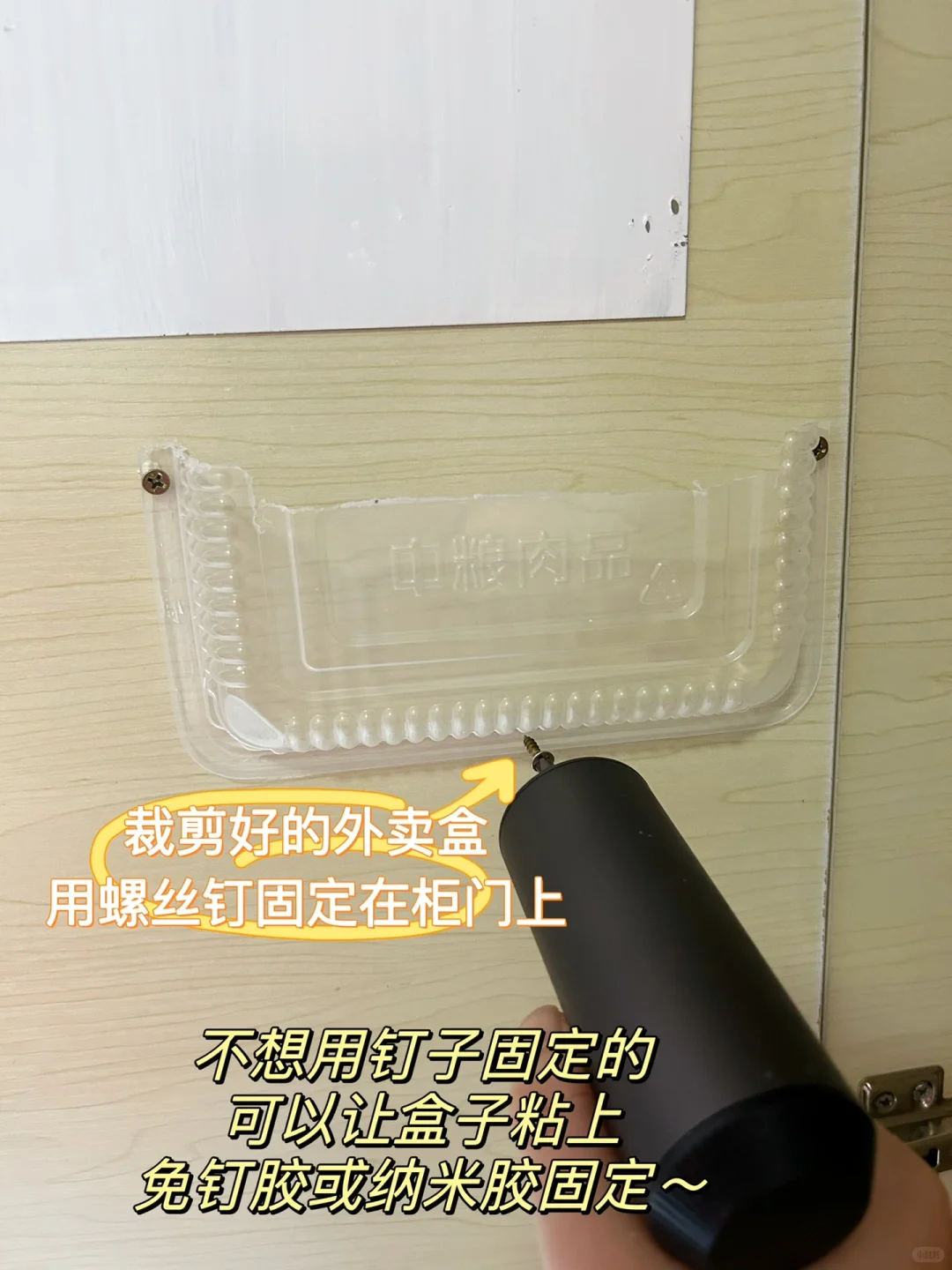 把平时家里一堆闲置的透明盒子,从中间剪开边缘的地方做一下处理,避免划伤手,剪成大小需要的尺寸就可以了,然后再固定在柜子门上。