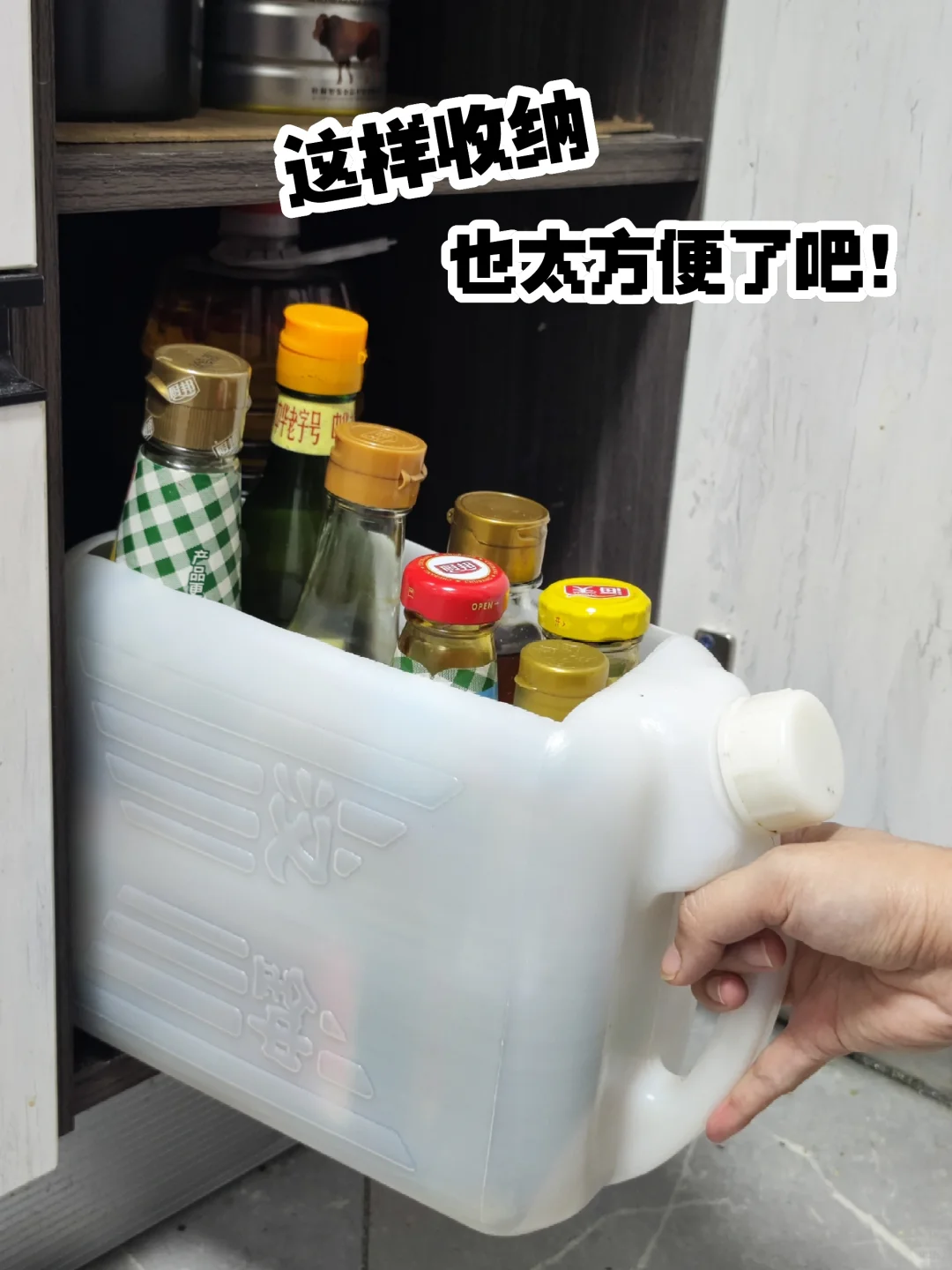 家里用完的空油桶刷洗干净之后将上面剪开一个开口,立马变成了可抽拉式的抽拉盒,正好放在厨房用来收纳这些瓶瓶罐罐的调味料特别方便。