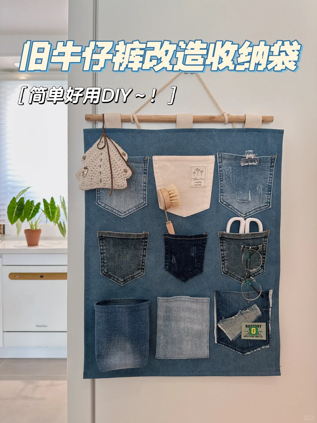 像这种墙上收纳袋根本不用花钱买,如果你家里有不穿的牛仔裤,可以将一条牛仔裤的裤腿剪下来当做底部,然后把其他牛仔裤的裤兜摘下来缝在底部上面,就是一个可以挂在墙上的收纳袋。