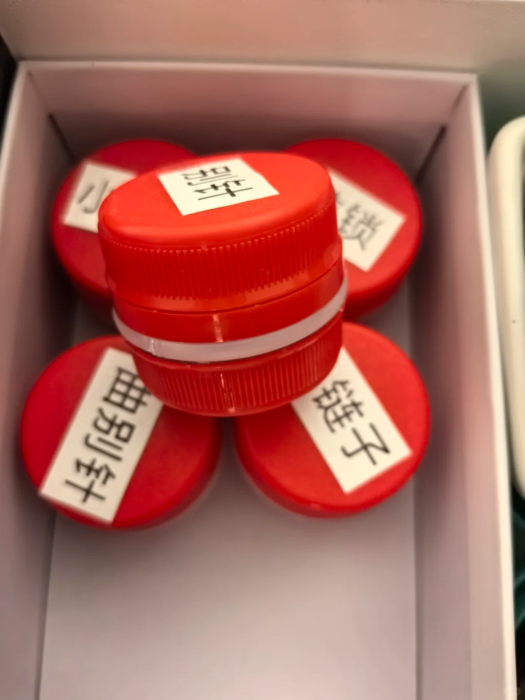 除了小瓶盖以外,还有湿巾盖子,可以将用完的湿巾上面的盖子取下来,两个盖子粘在一起就是一个小小的收纳盒,放在包包当中可以收纳发夹,项链首饰等一些小物件。