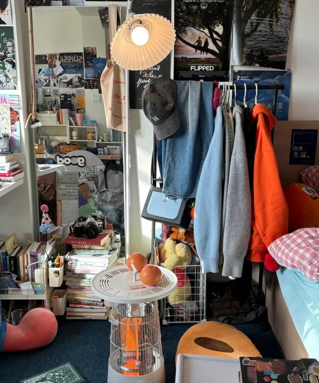墙壁也没白费,上面密密麻麻贴的是电影海报还有老CD。不知道是不是审美没跑偏?旁边一排开放式衣架常穿的衣服全晾出来,下方还配个网红小台灯,拍出来朋友圈点赞直接起飞。