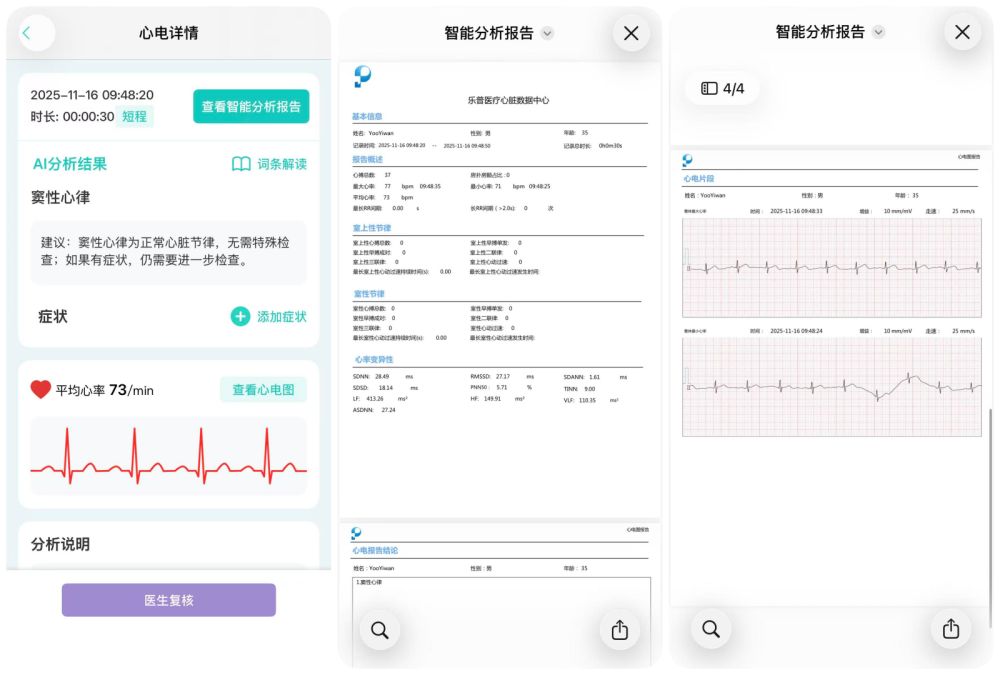其搭载临床 AI-ECG算法,筛查心脏问题,房颤准确率高达 99.97%,降低房颤漏诊率82.1%。测量后不仅能生成详细的 AI 分析报告,搭配专业术语讲解视频,如果对结果有疑问,可申请乐普医疗执业医师团队对报告进行专业解读(解读结果仅供参考,具体诊断请以线下医疗机构为准)。