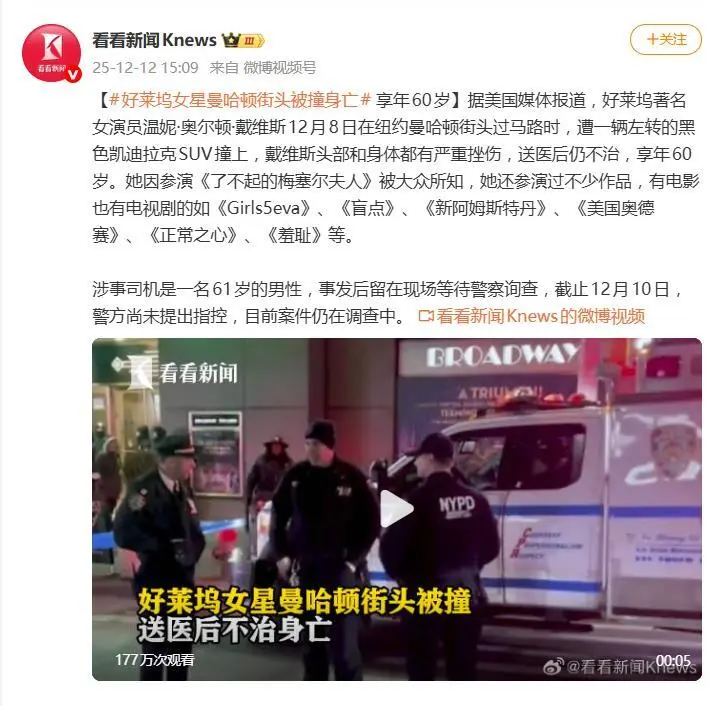 当地时间12月8日晚9点,纽约曼哈顿中城西53街与百老汇的繁华路口,一声刺耳的刹车声划破都市喧嚣——曾出演热门美剧《了不起的麦瑟尔夫人》的女演员温妮・阿尔顿・戴维斯,在过马路时被一辆左转的黑色凯迪拉克XT6SUV撞倒,头部和身体遭受重创,虽被紧急送往西奈山医院抢救,最终仍因伤势过重不治身亡,享年60岁。