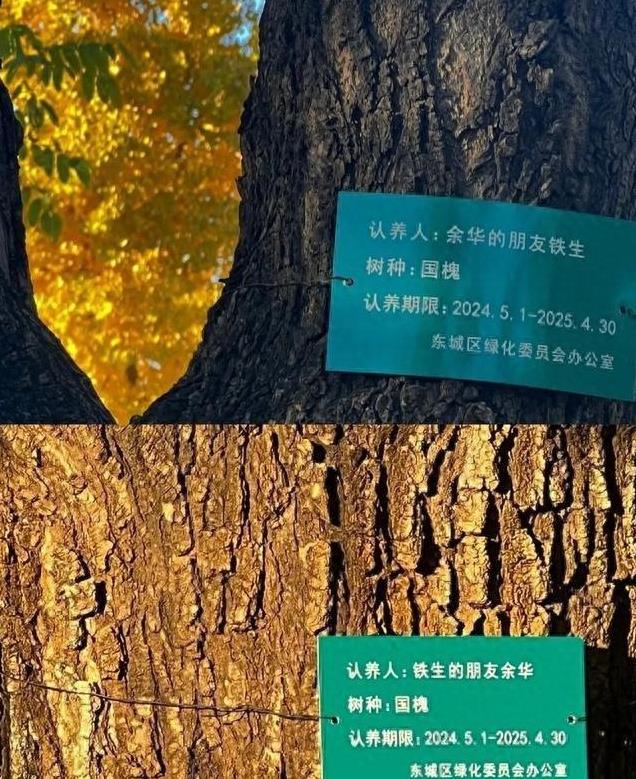 图1-2:地坛公园有两棵树,见证了余华和铁生的友谊。在“认养人”的位置,分别写着:「余华的朋友铁生」「铁生的朋友余华」。(图/小红书@番女士的座机生活)
