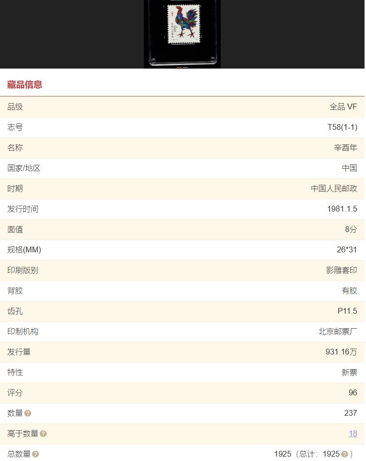 作为家喻户晓的传奇猴票,相信很多邮友都有或想收藏,通过上方的二维码,能看到更多的有用信息和统计,比如这个猴票,源泰评级都评了3600多枚。但是,源泰这三千多枚猴票里能达到我这枚VF96分的,只有300枚出头,仅占总数的不到10%,可以说是兼顾优秀品相和稀缺属性了。