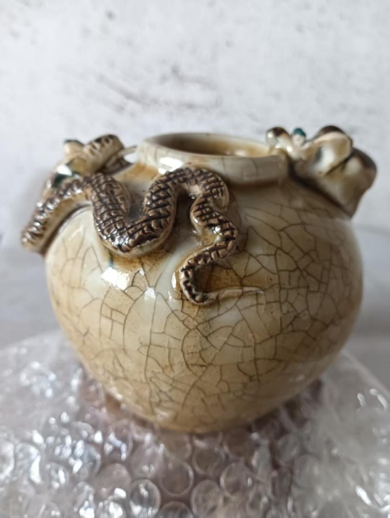 这种堆塑工艺的难点在于**“塑形与烧造的平衡”**:立体雕塑部分的瓷土厚度与水盂胎体不同,易在烧制中出现开裂、变形;而釉料在雕塑表面的流动与堆积,也需精准控制才能保证纹饰清晰。这件水盂的蛇鼠雕塑与冰裂纹釉完美融合,足见匠人对火候与釉性的极致掌控。