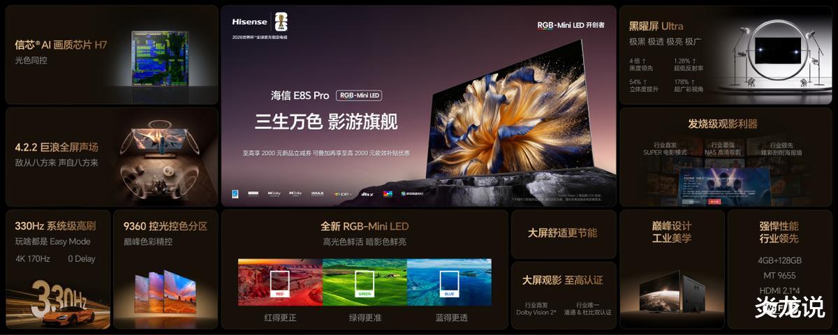 同场发布的“影游旗舰”海信E8S Pro,则专为对动态画面和响应速度有苛刻要求的影游玩家打造。它同样得到了“王炸双芯”与黑曜屏Ultra的双重加持,拥有9360个控光控色分区,确保巅峰级的色彩精准控制。
