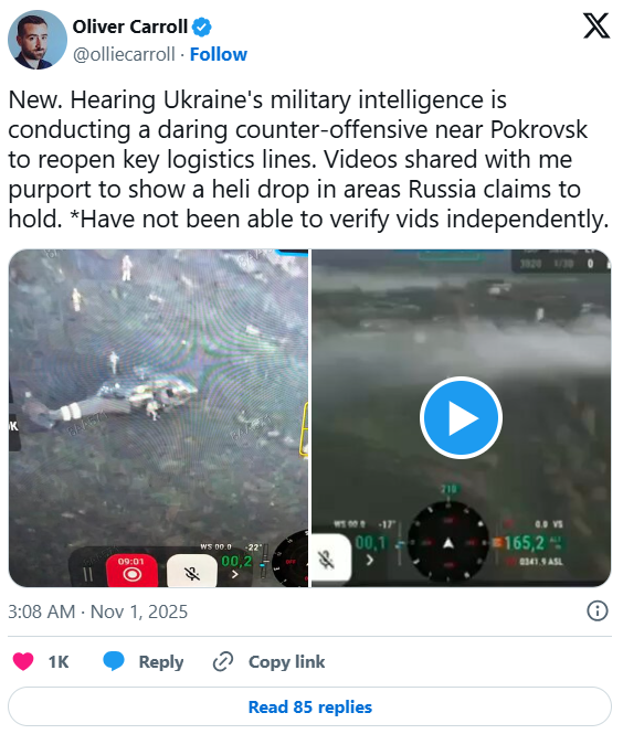 同一天,《经济学人》记者也分享了未经证实的镜头,似乎显示一架直升机降落在波克罗夫斯克附近的俄罗斯控制的区域。这位记者表示,“听说乌军情部门正在波克罗夫斯克附近进行大胆的反攻,以重新开放关键的后勤线路”。