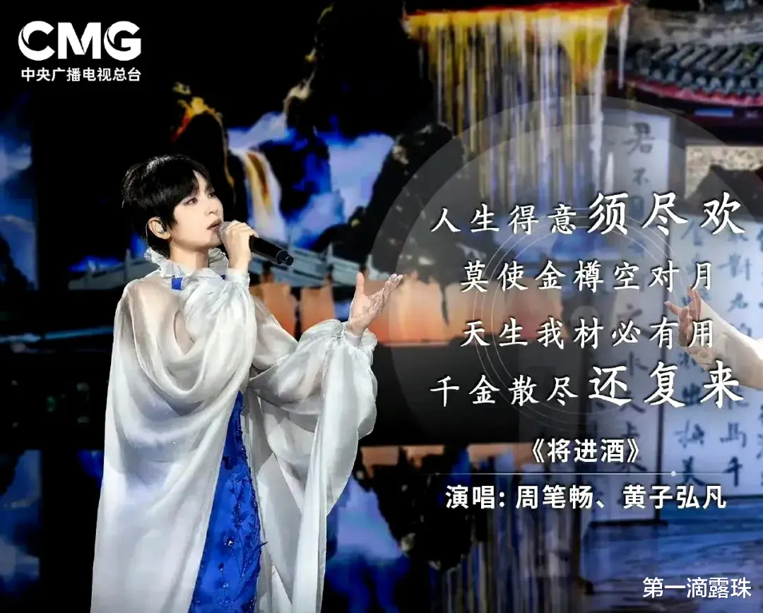 周笔畅和黄子弘凡合唱的《将进酒》,作为第二篇章“是吾乡”的开篇曲,铿锵豪迈,瞬间将晚会氛围拉满。