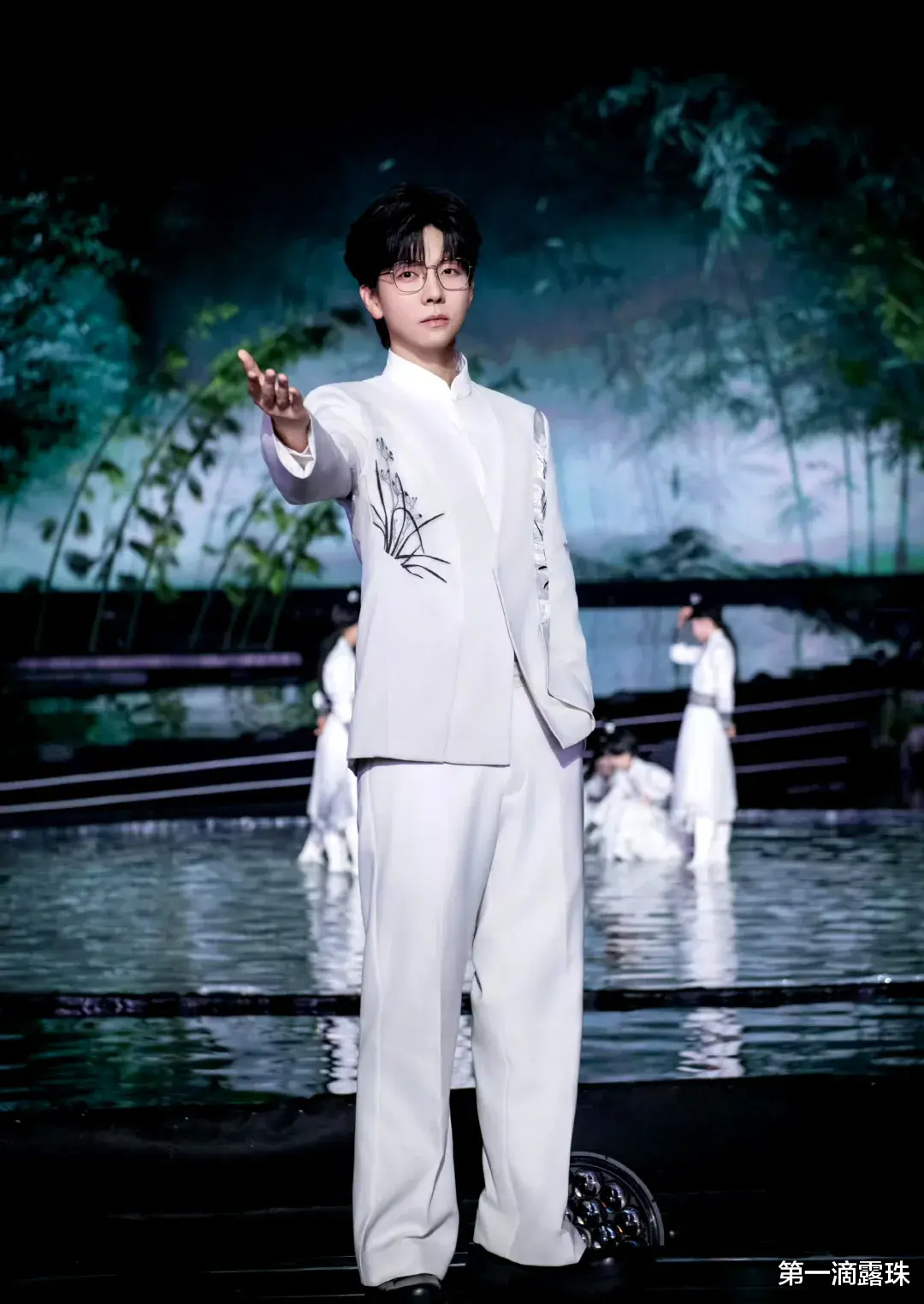 欧豪则穿着白色鳞片西装,在灯光下熠熠生辉,动态时仿佛披着星河登场,硬朗气质和闪钻设计形成反差,舞台氛围感直接拉满。