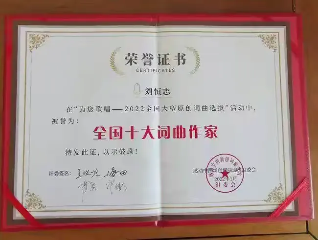 因创作海军新时代军歌《走向深蓝》而成为“走向深蓝”一词发明人,在《感动中国》人民喜爱的艺术家全国听(观)众群众性评选中,凭借《走向深蓝》(霍勇演唱)、《海军蓝》《大海誓言》(吕继宏演唱)、《领航新时代》(石克昭.刘玲曲.刘丹丽演唱)《撸起袖子加油干》(何沐阳曲、周深等演唱)、《农民父兄》(春雷演唱)、《我们是英雄护航兵》《奔向海洋-海军士官学校校歌》《我们一同走过从前》(康澎曲 董文华演唱)、《战士·界碑·祖国》(于乃久演唱)、《伴你人间天地情》(杜克曲 白雪演唱)、《军旗情》(朱虹演唱)、《更多的时候》《足迹》(楚兴元曲、杨洪基演唱)、《光照四季》(莎光曲 谭晶演唱)、《丽江酒歌》(许镜清曲、阎维文演唱)、粤韵歌曲《领航新时代》(刘恒志作词,陈仲琰、卢华作曲,叶幼琪演唱)、《启航》(万山红演唱)、《永远青春的中华魂》(戴玉强、黄华丽演唱)等,荣获“中国十大词曲作家”称号。
