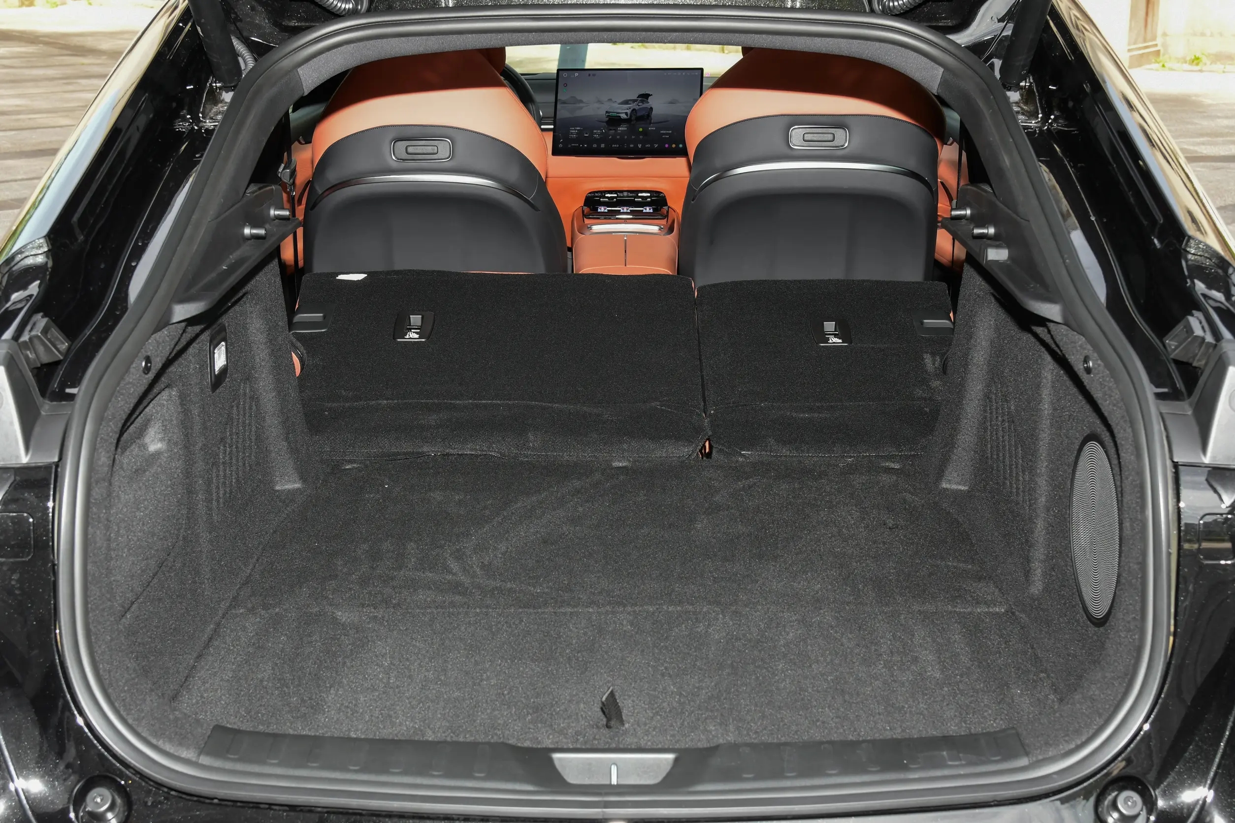 车尾则使用了Super Red贯穿式红光LED尾灯组(1.2 米长度136颗LED灯珠的亮度和穿透性表现不错,雨雾天气能有效传递行车信号,可点亮的尾标进一步强化了品牌辨识度),并且还使用了电动掀背式后尾门+电动升降尾翼(车速90km/h自动展开、170km/h提供145N下压力,高速行驶时能提升稳定性)。
