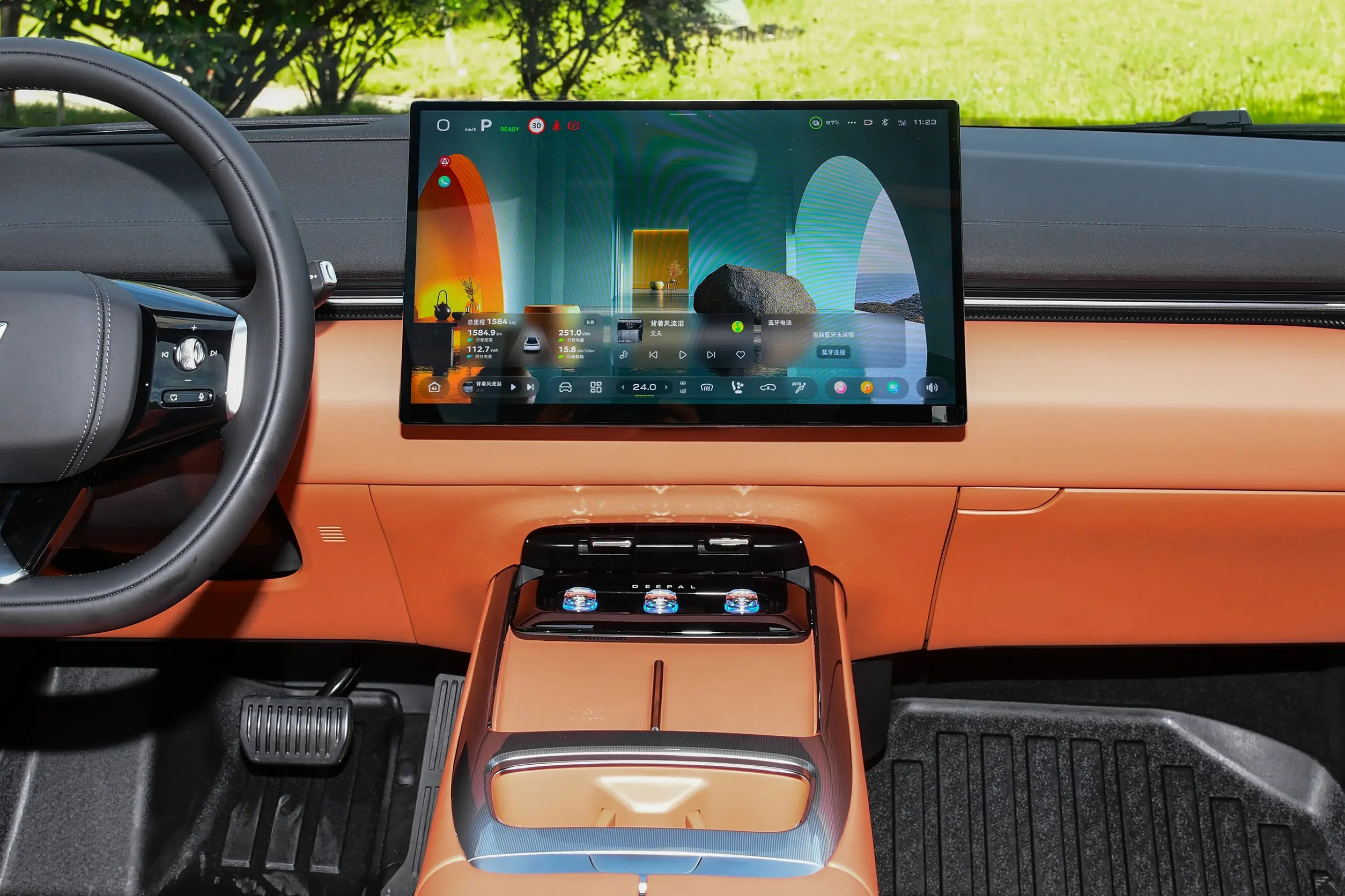 中控台布局:三幅式平底方向盘、电子怀挡换挡机构、55英寸AR-HUD全息式增强现实系统、15.6英寸悬浮式中控屏。