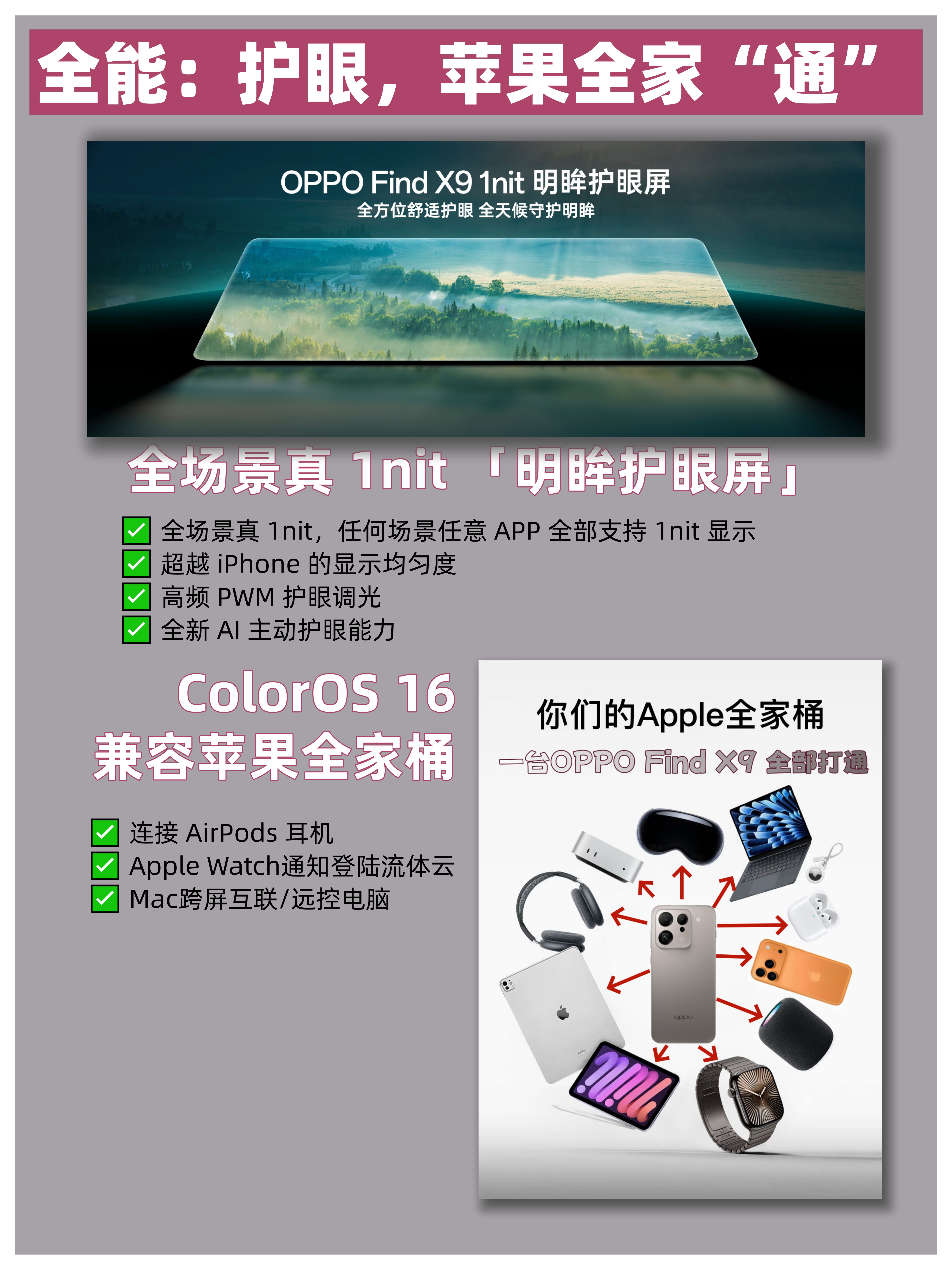 此外,Find X9系列还具备全场景1nit明眸护眼屏、兼容苹果设备的无缝生态互联,以及80W有线与50W无线超级闪充。如此全面均衡的旗舰配置属实很难不让人心动,反正我已经是准备好首发入手了!