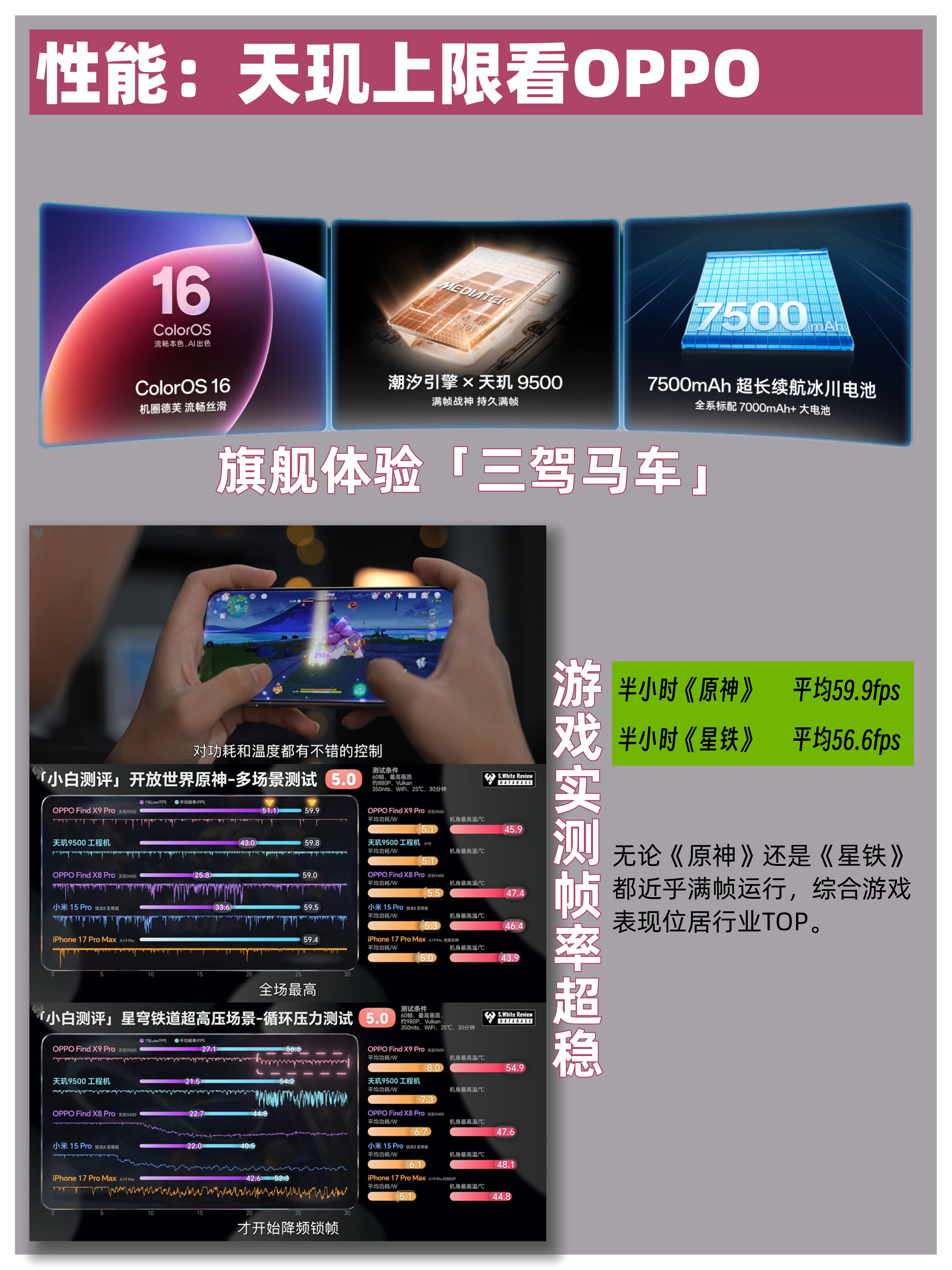 针对游戏体验,Find X9系列搭载天玑9500旗舰芯片、ColorOS 16与潮汐引擎、超过7000mAh大容量电池组成的性能三驾马车,能确保长时间游戏依然流畅稳定。