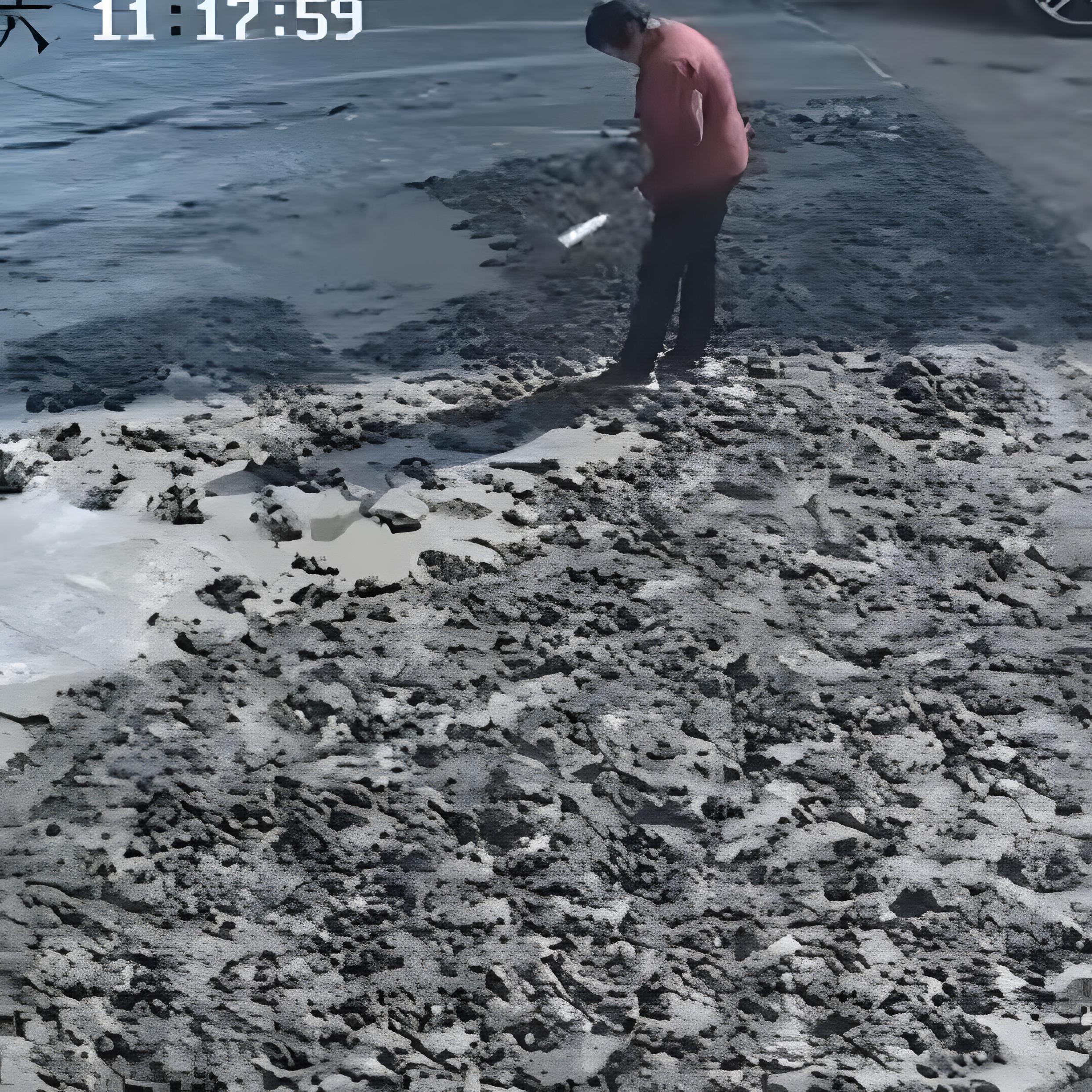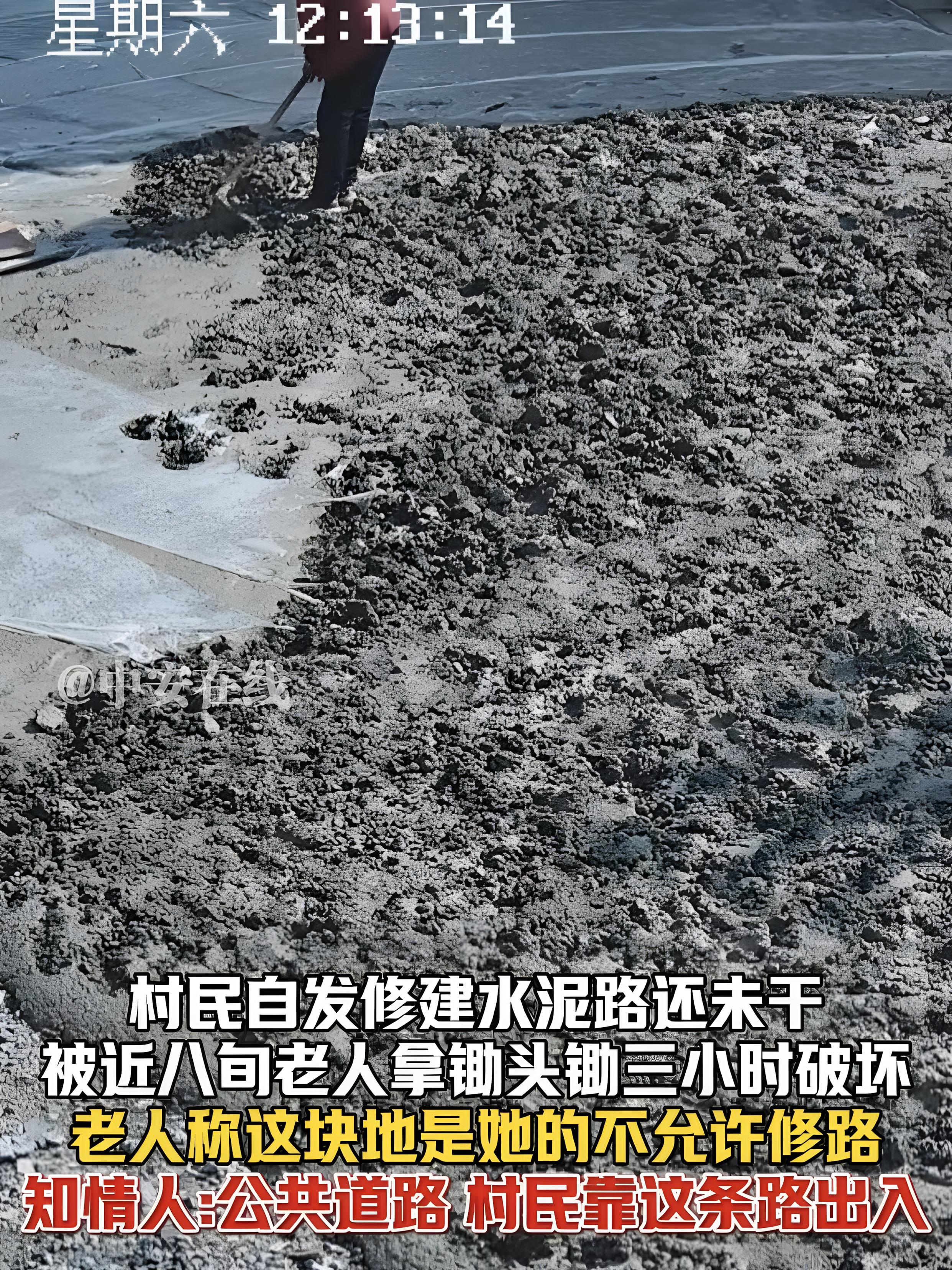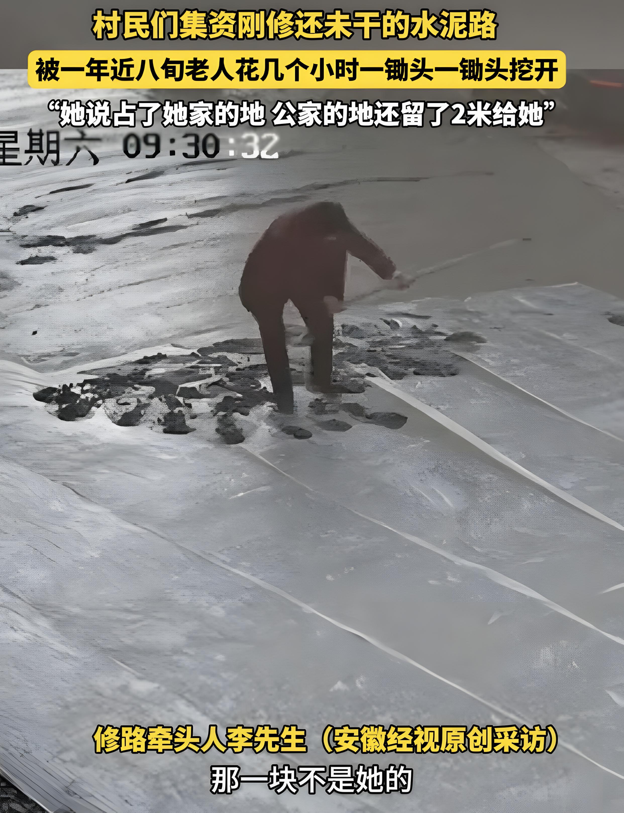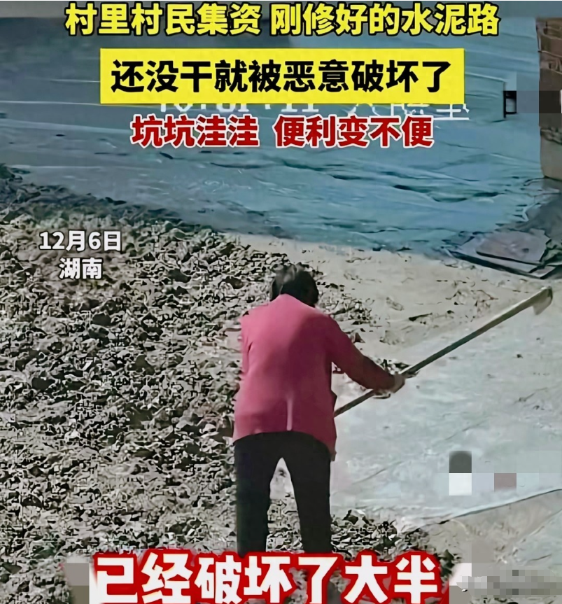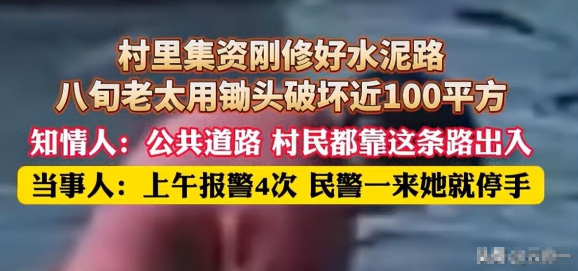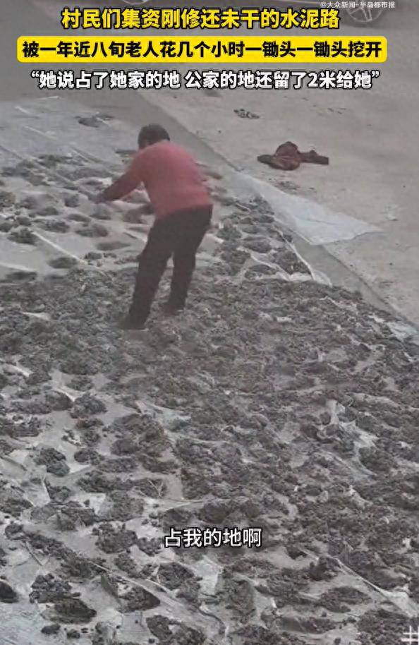 从早上七点到中午十一点,四个钟头里,老人就蹲在路边,像侍弄庄稼似的“打理”新路。她先用锄头尖刨开水泥表层,再用锄头把捣碎,没一会儿就挖出个碗大的坑。路过的村民劝她“歇歇”,她头也不抬地说“我自家的地,想咋弄咋弄”;村妇送热水给她,她直接挥手打翻。监控画面里,老人单薄的身影在太阳下晃着,那股子执拗劲让人又气又心疼。老人顶着烈日连凿四小时,任谁劝说都不回头,新路被挖得坑洼如蜂窝。