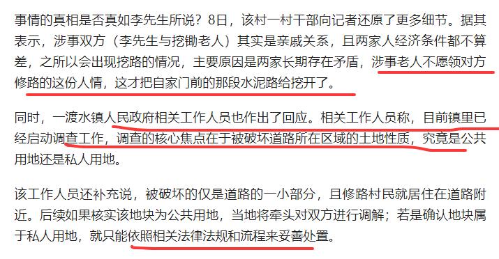 “要想富,先修路”这话,在村里墙上刷了十年。2025年的今天,周边村子早就通了柏油路,就他们村还在跟泥路较劲。村支书说,已经联系了乡镇司法所,接下来会联合老人的子女做调解,同时申请临时资金先把路补好。“不能因为一个人的气,耽误全村人的日子。”乡镇部门已介入调解,村民盼着早日修好路,更盼着解开人心的“结”。