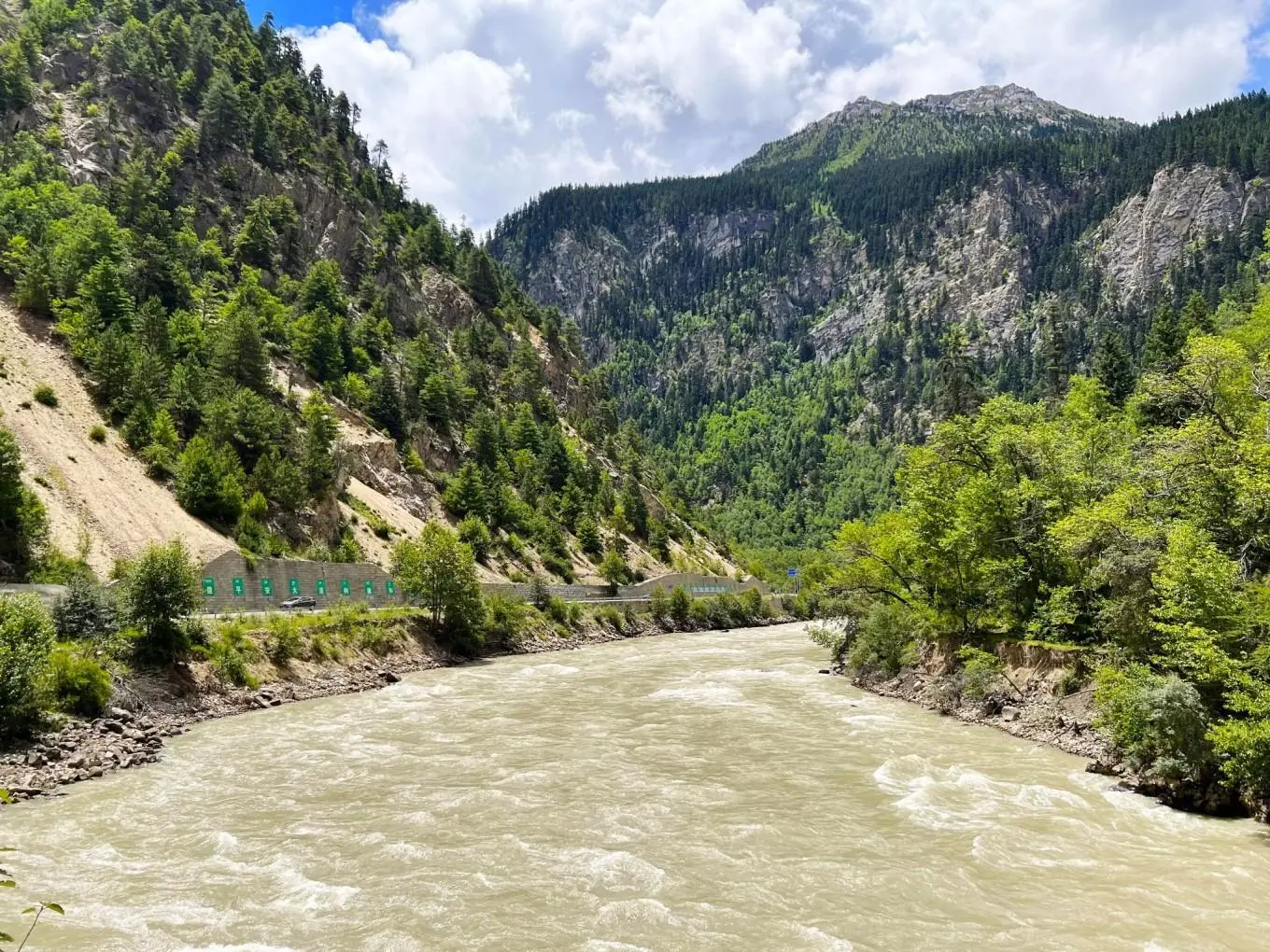 平静的然乌湖水变成了湍急的额公藏布河水,隔着车窗仿佛就能听到激流澎湃的声音,河水奋力向前,劈开一座又一座的山峰,一往无前。