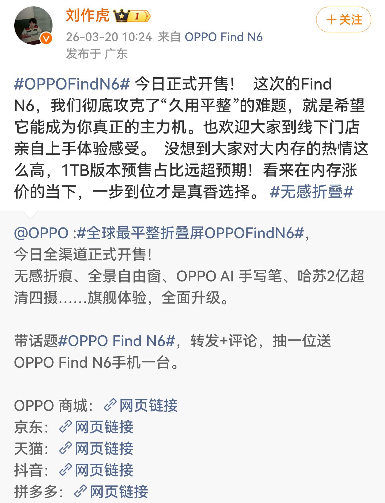 哦对了,最近听到个消息,Find N6的1TB版本竟然卖断货了! 一开始我还纳闷,现在谁需要那么大内存啊?后来一想,也是——这手机生产力属性太强了,全景自由窗多任务一开,再加上AI手写笔(那支笔磁吸充电的设计我也很喜欢,不用给机身挖孔,笔还不容易丢),很多商务人士直接把它当半个平板用了。装一堆工作文件、存大量高清照片视频,再配合大屏办公,1TB这配置还真就成了刚需,卖爆也就不奇怪了。