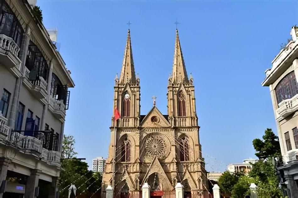 石室圣心大教堂由地面到塔尖高58.5米,气势恢宏,全身都由花岗岩打造;教堂具有哥特式教堂的所有构图元素,既有早期建筑风格的彩色玻璃窗,又具中、晚期建筑风格的双钟楼尖塔等。