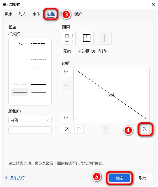 4.在「边框」区域的预设样式里,找到右下角的斜线图标,点击该斜线。