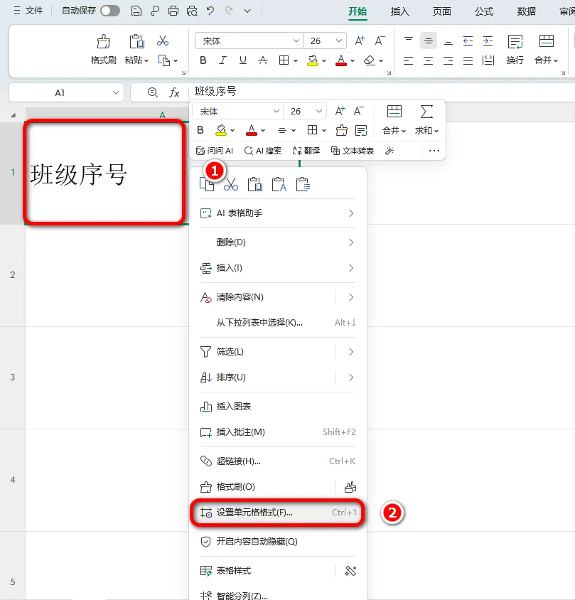 1.打开 Excel 表格,找到需要制作斜线表头的单元格,这里以 “班级序号” 的「A1」单元格为例,点击选中该单元格。
