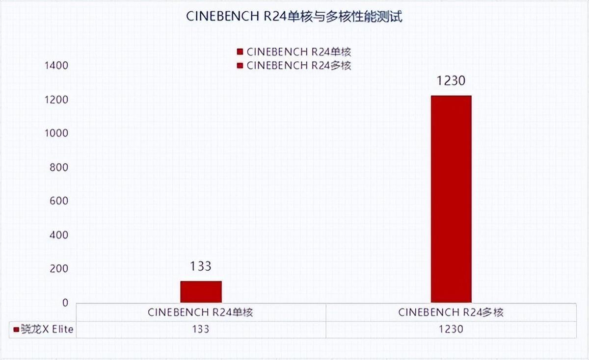 那么骁龙X Elite两个不同版本都会有怎样的性能表现呢?虽然目前还没有搭载骁龙X Elite的商用终端上市,但是高通在骁龙X Elite的发布现场已经带来了两款参考设计,对应不同的骁龙X Elite版本。在CineBench 2024的渲染性能测试中,高性能版本骁龙X Elite跑出了单核133分、多核1230分的好成绩。