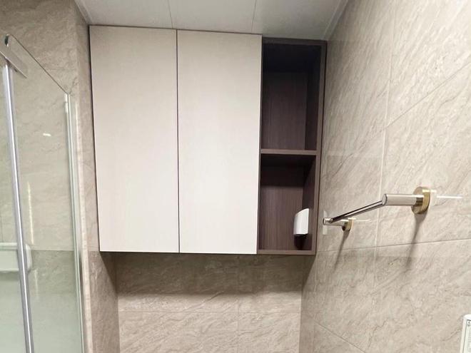 卫生间装修还得是看年轻人,他们采取的是壁挂式的浴室柜和镜柜的组合。将浴室柜悬挂,墙面镜柜延伸到,两个柜子几乎解决了卫生间所有物品的收纳。