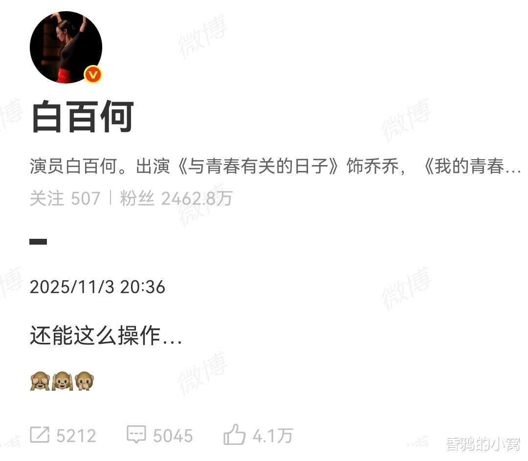 11月3日晚,演员白百何在新浪微博发布了仅有七个字的内容:“还能这么操作…”,同时配上了捂眼、捂耳、捂嘴的表情包。