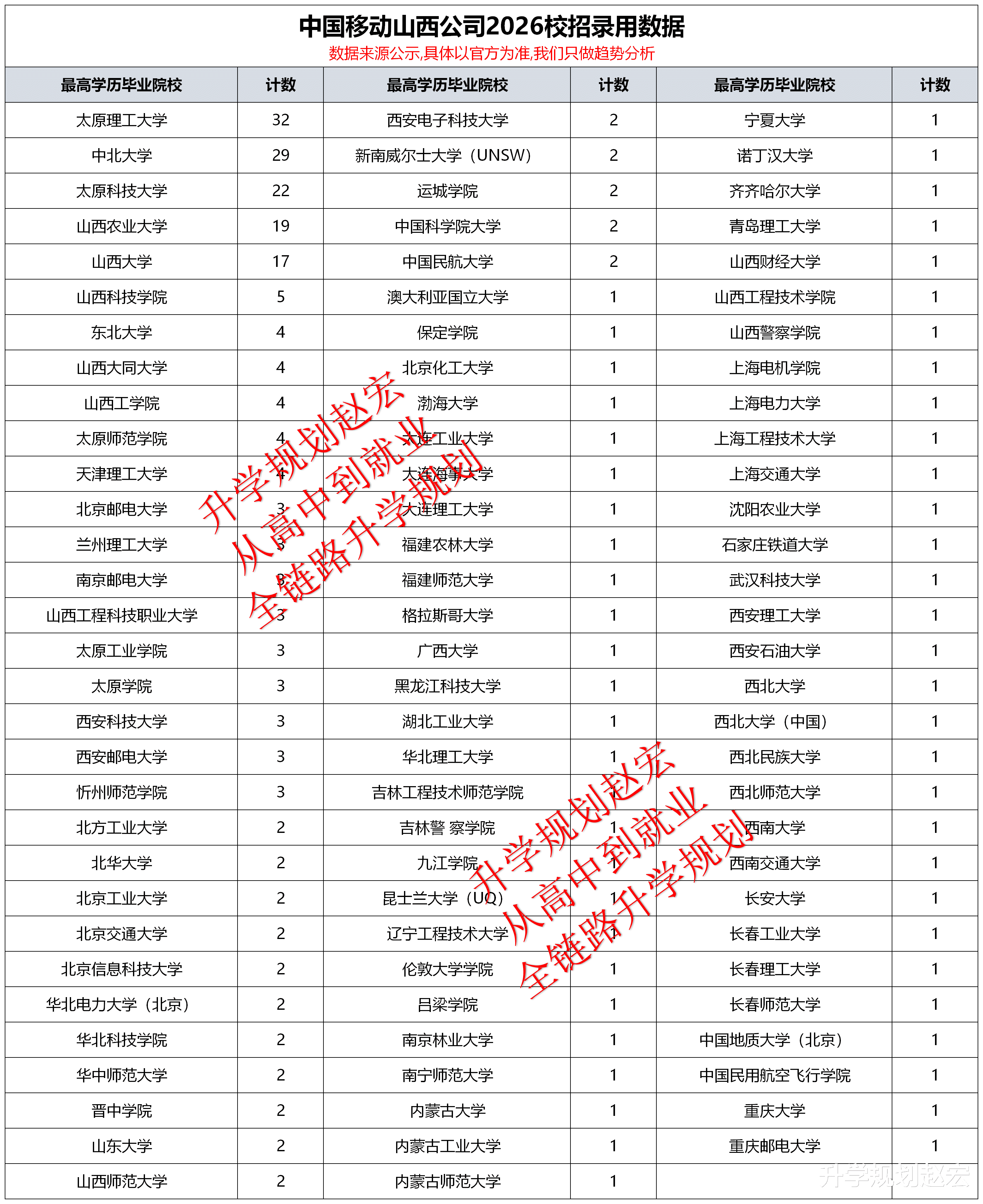 山西移动2026录用259人,研究生占50%,太原理工人数最多
