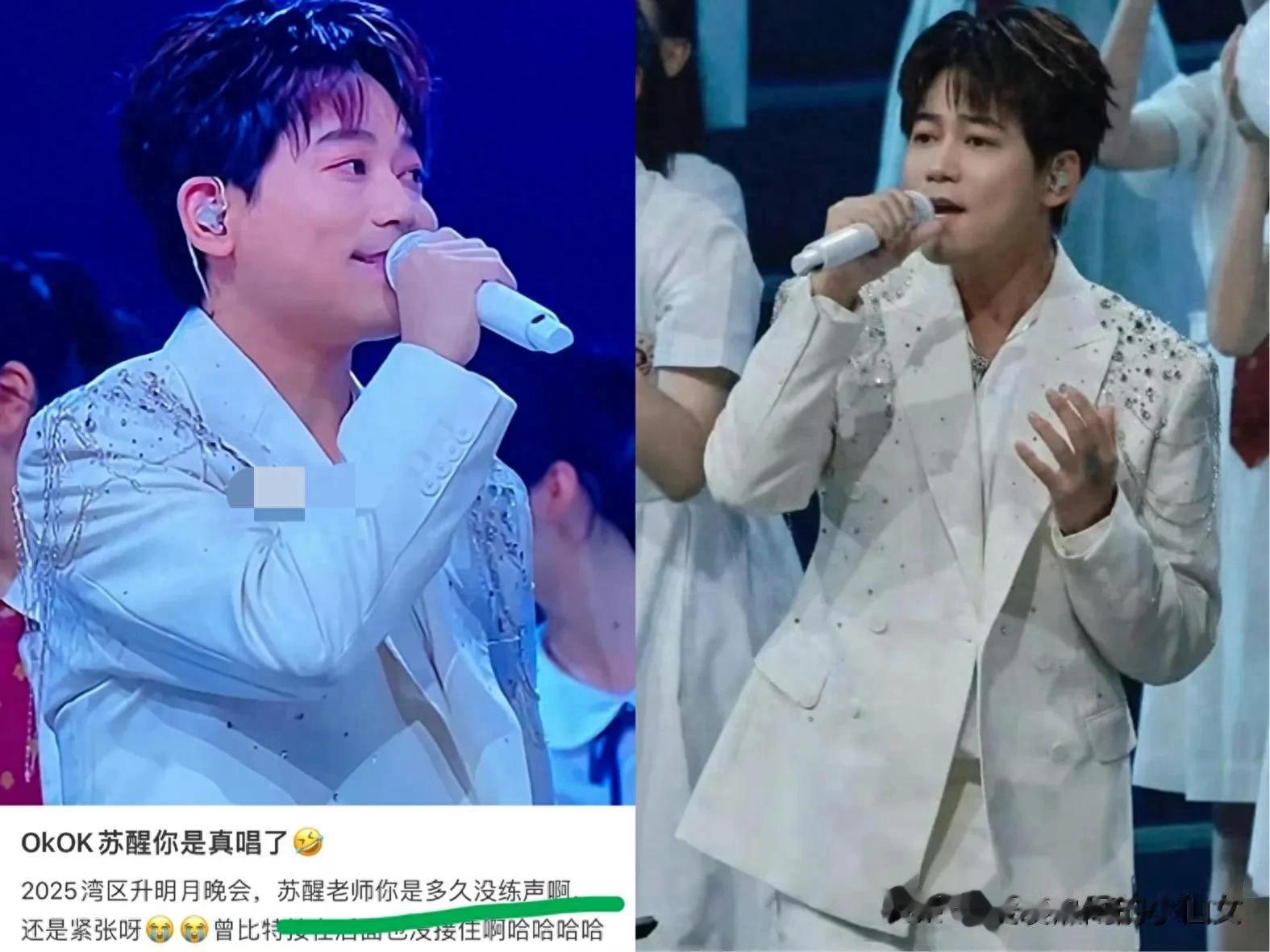 苏醒在今晚合唱《夜空中最亮的星》时,可能有点紧张,所以跑调了,网友笑称他是多久没练声了。