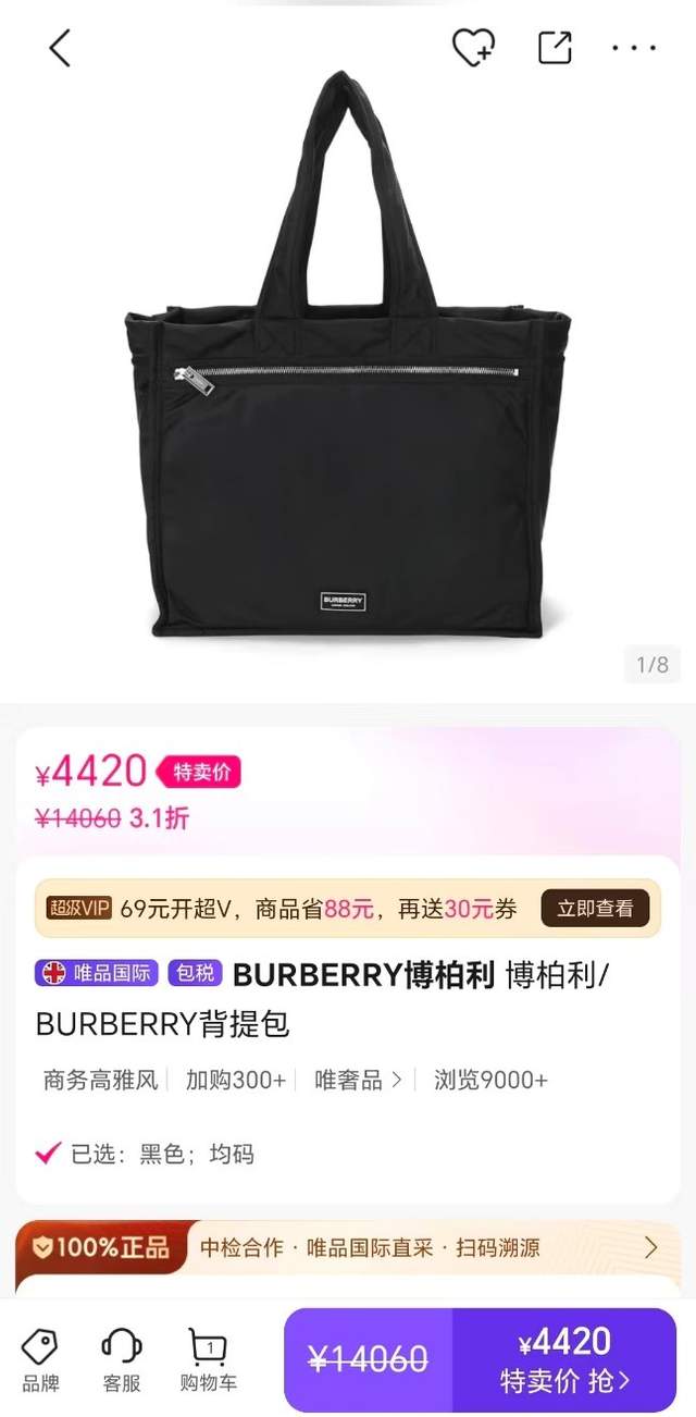 后面我抱着试一试的心态打开 APP,平台正好有国庆的特卖专场,搜Burberry托特包,虽然没找到之前看中的那款,却发现不少心动之选,最后相中一款原价14060元、打3折后4420元的黑色背提包。
