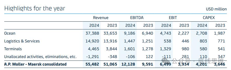 马士基各板块营收,总营收554.82亿美元,航运营收373.88亿美元,占67.38% 。 图表来自马士基2024年年报