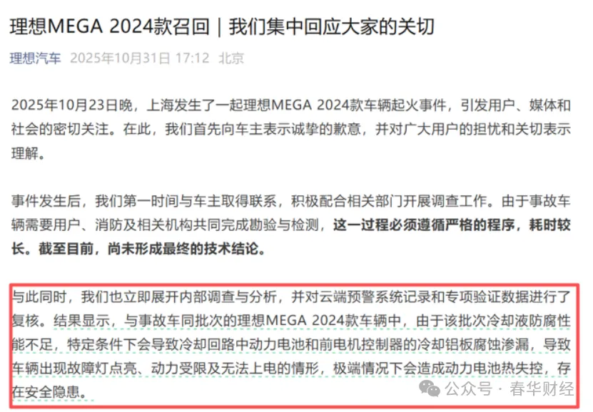 冷却液腐蚀铝板、电池热失控风险,一起行驶中起火事件,促使理想汽车紧急召回11411辆MEGA。