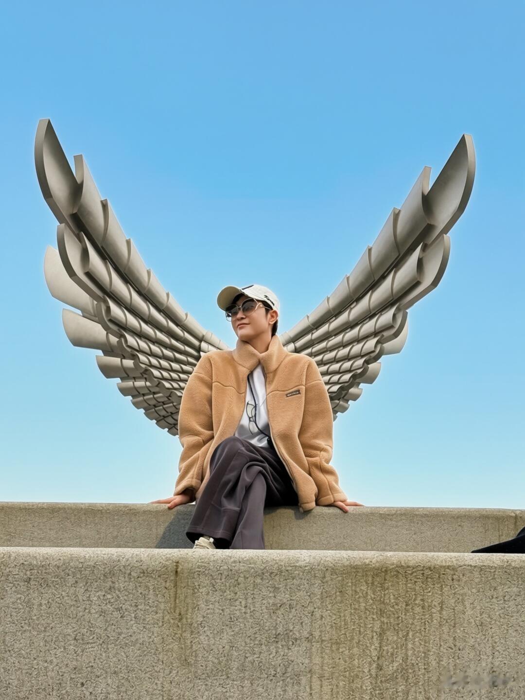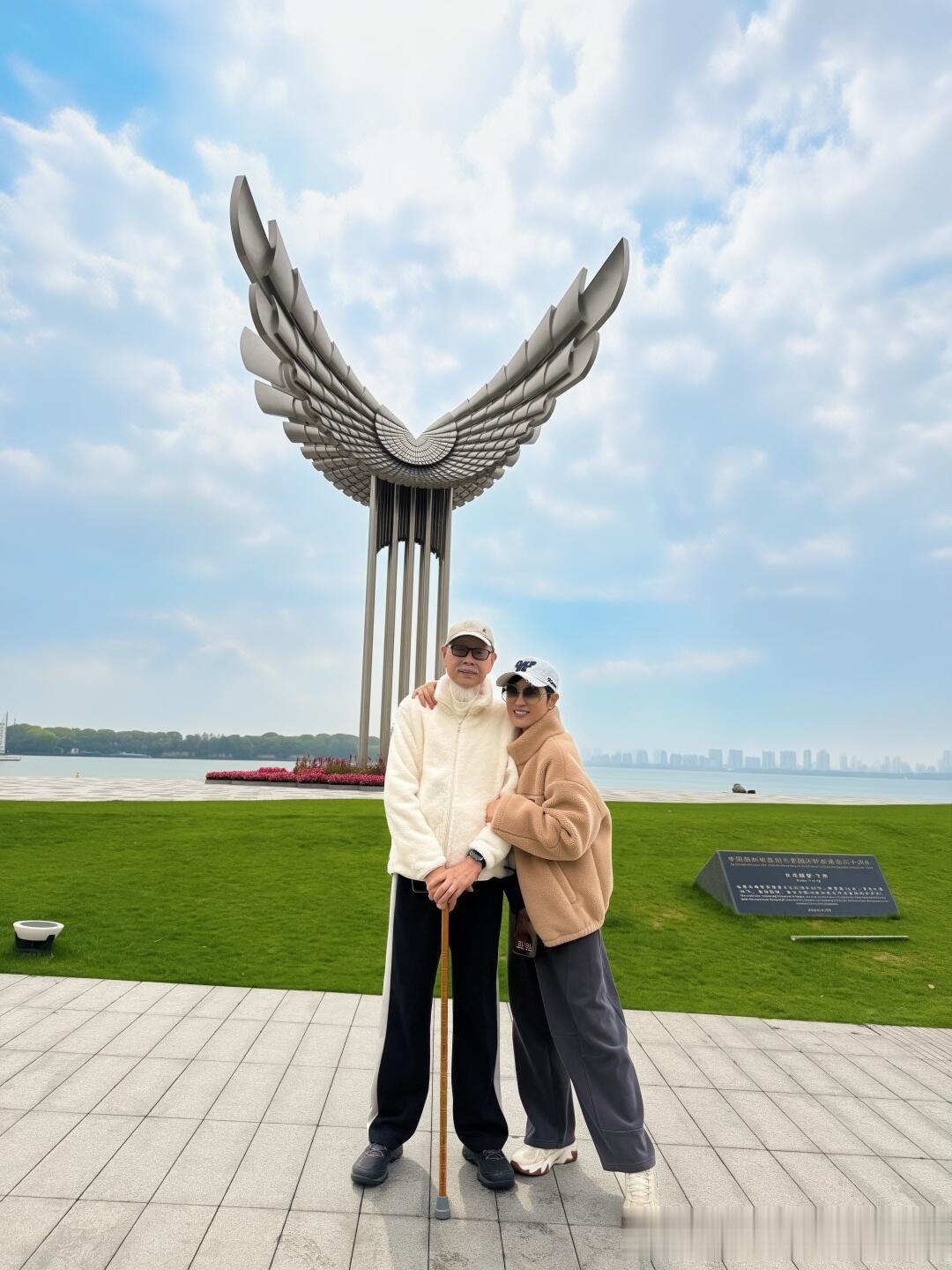陈法蓉还单独拍了一组“翅膀雕塑”打卡照,坐在雕塑下的她,仿佛自带光环,颜值和气质依旧在线,随后她又和父亲在雕塑前合影,亲密地搂着父亲的肩膀,父亲一脸温柔,满是被女儿陪伴的幸福感。