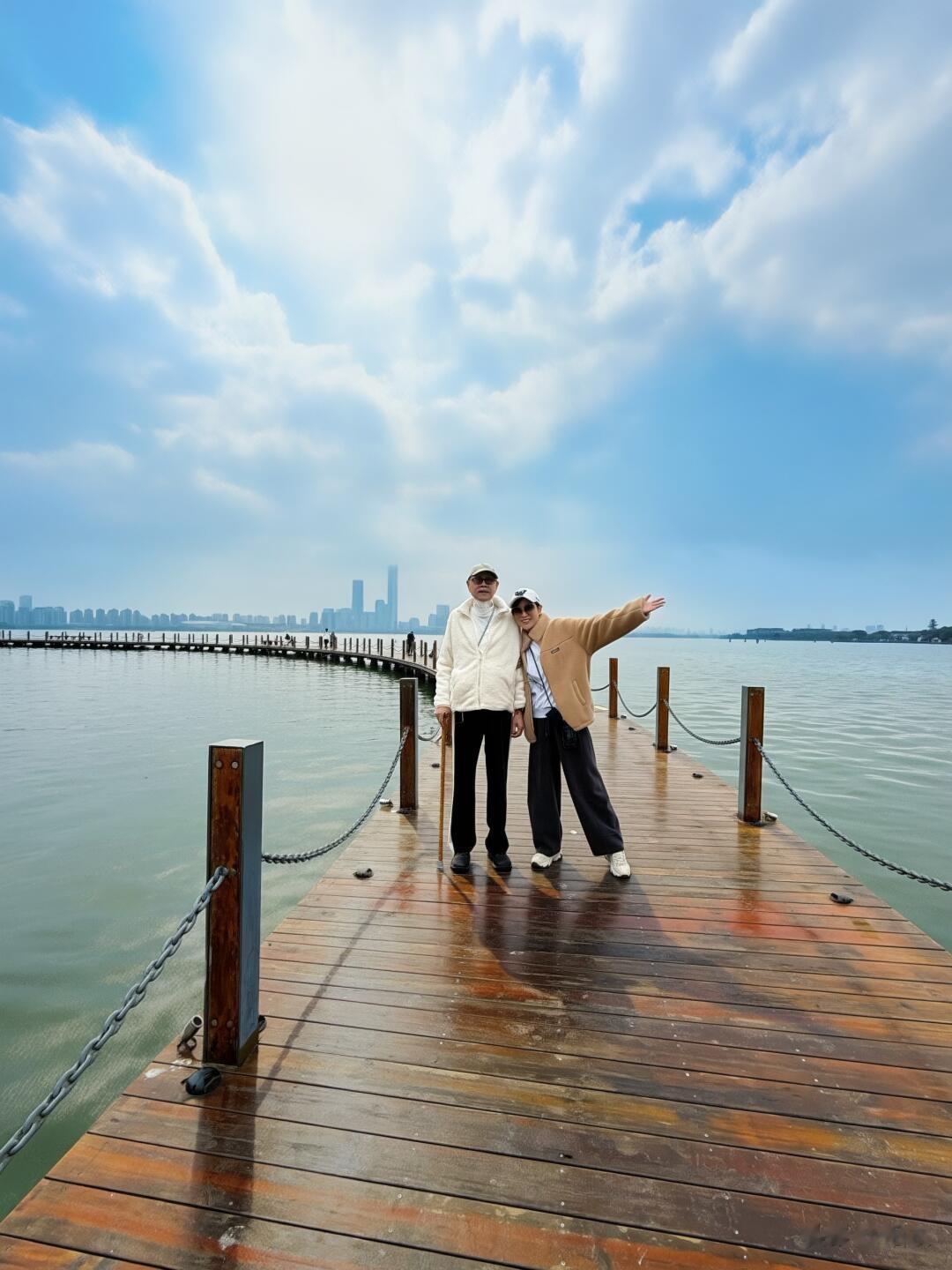 在李公堤的石桥上,父女俩站在刻有精美花纹的石阶上,身后是古色古香的中式亭子,现代与古典交融,画面超有氛围感,在湖边的石栏旁,陈法蓉紧紧抱着父亲,背景是苏州的城市高楼和开阔湖面,每一张照片都充满了温馨的烟火气。