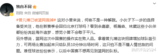 青岛记者杜金城发文点评:这对小曾来说,何尝不是一种解脱。小伙子下一步的选择备受关注,他在新赛季会回归北京打球吗?看到余嘉豪、杨瀚森、林葳这些小伙伴都纷纷奔赴海外追梦,感觉小曾不会甘于平凡。