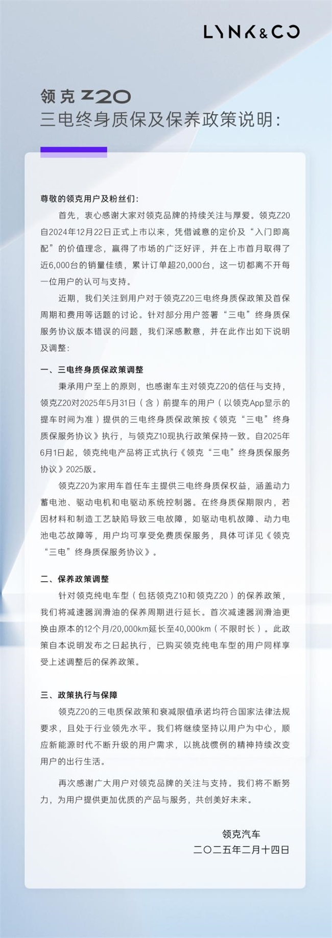 在领克 Z20 销量持续攀升的过程中,消费者对于车辆的三电质保政策也产生了一些讨论。秉持着以用户为中心的理念,领克在了解到消费者的关切后,迅速做出了回应。领克官方决定将领克 Z20 的三电质保政策调整为与领克 Z10 保持一致,并在 2025 年 2 月 14 日正式对外发布了相关公告。
