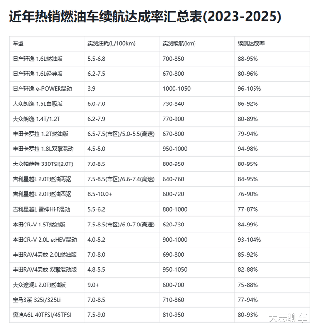 我们可以参考这张表格,事实上,大部分燃油车的续航达成率都并不是很好,甚至有些车辆要是跑高速,一样也会出现续航焦虑的问题,甚至有些燃油车的续航达成率只有少得可怜的75%了,如果你要是冬天来了,又不懂怎么用发动机,那续航更是能够朝着对半砍,可是,即便这样了,似乎我们很少,甚至看不到油车车主抱怨续航焦虑,这是为啥?