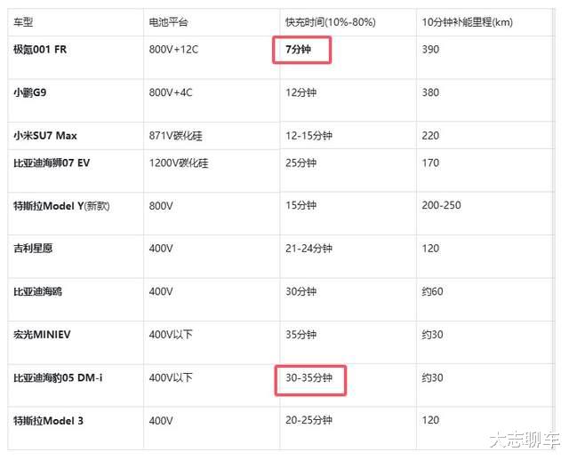 电车最大的问题,就在这个地方了,补能速度真心不敢恭维,实在是太慢了,我整理了一张表格,对比国内十款热销的电车快充速度,哪怕是极氪001,这种用800V+12C超级快充的大佬,快充时间也需要7分钟以上,更有甚者,400V的快充,还需要半小时的时间,要是遇到等车和排队,那恭喜你了,少说1小时起步。