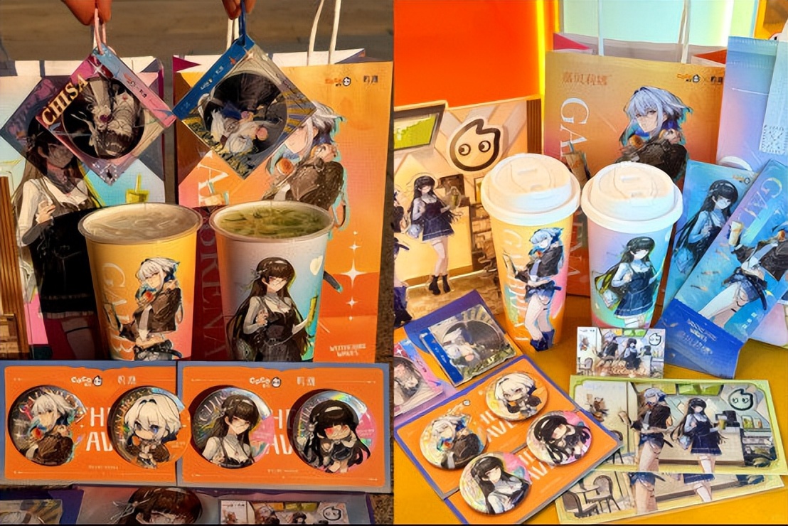 饮品之外,品牌还设计了丰富的限定包材与周边,包括角色主题杯、纸袋,以及采用水波纹闪耀工艺的镭射票、徽章套组、亚克力立牌和CD挂件套组等。不仅提升了周边的收藏价值,更让游戏玩家 “漂泊者们”直呼仪式感满满,在社交平台上引发热议。