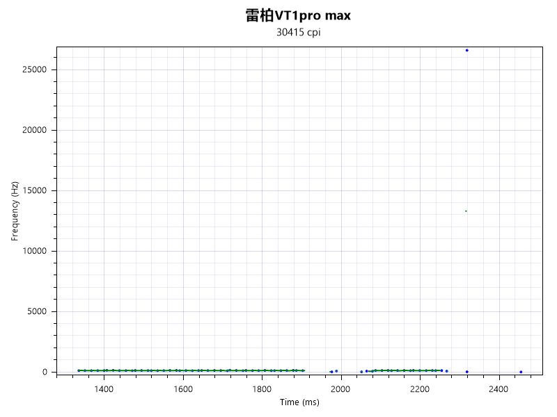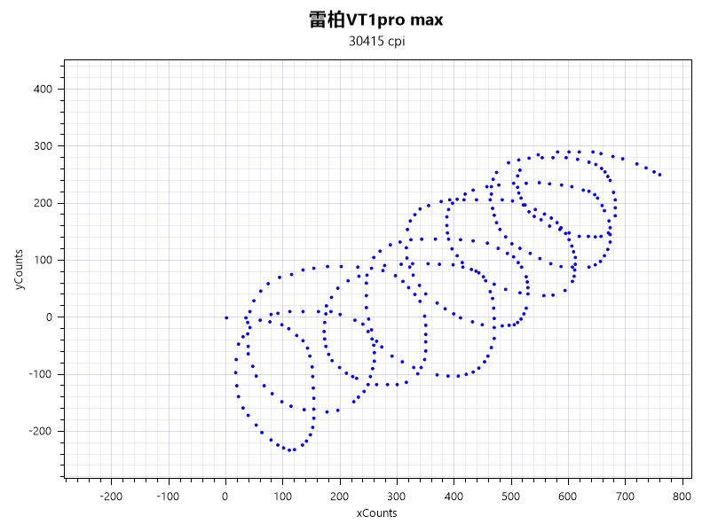 体现在mousetest上就是看点跟线的接近程度,蓝色的点越靠近绿色的线,说明偏移量越少,可以看到雷柏VT1PRO MAX的点基本上与线重合,说明偏移量很低。