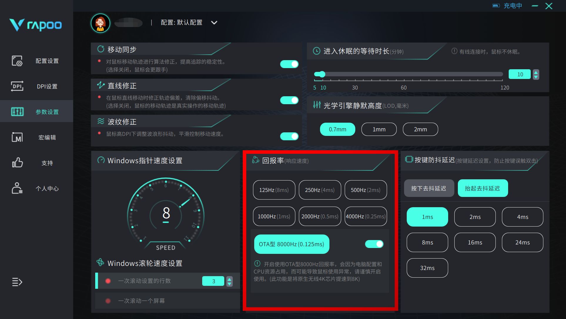 雷柏的V+WIRELESS无线游戏技术让鼠标的延迟低至0.125ms,10米+的传输距离还能保证鼠标不被其他设备干扰。